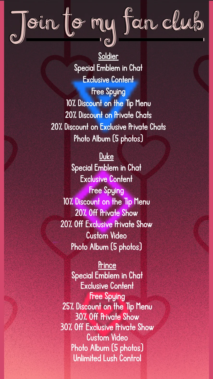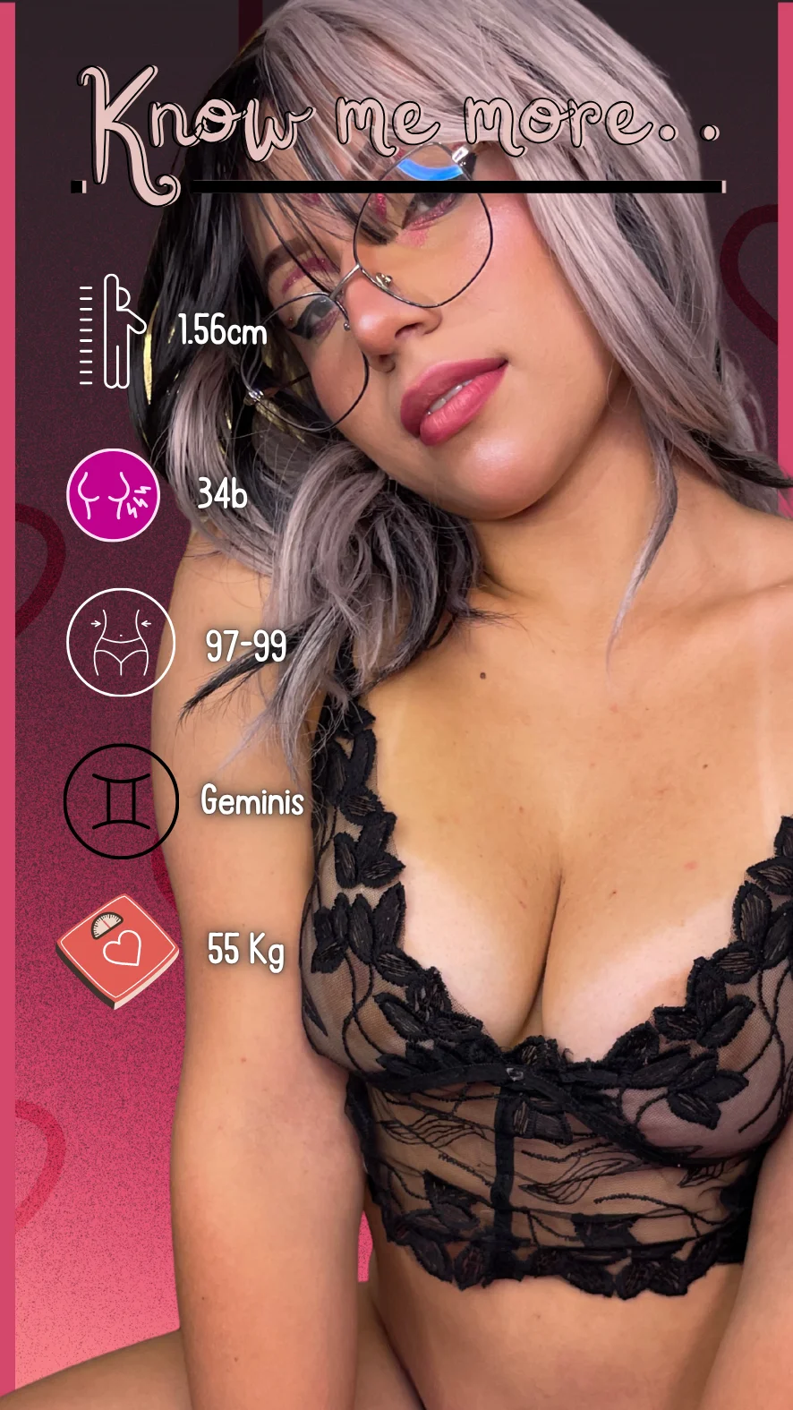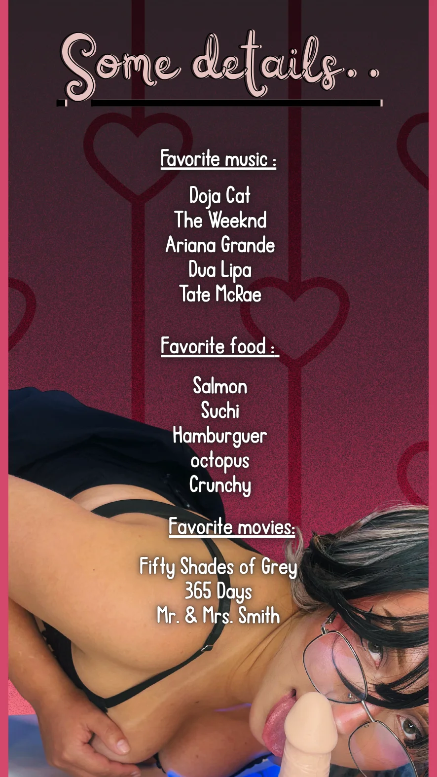 Erotisk dans, Kameltå, Kukkvurdering, Skittensnakk, Stripping, Twerk, Kontor, Massasje, Doggy style, Spanking, Ydmykelse, Ahegao, Cumshot, Dildo eller vibrator, Cowgirl, Toppløs, Hæler, Blotting, Fingring, Facial, Fotfetish, Orgasme, Oljeshow, Onani, Doble penetration + extra, Squirt + extra, Anal + extra, Rollespill, Sexleketøy, Puppeknull, Blowjob, Gagging, Ræv til munn